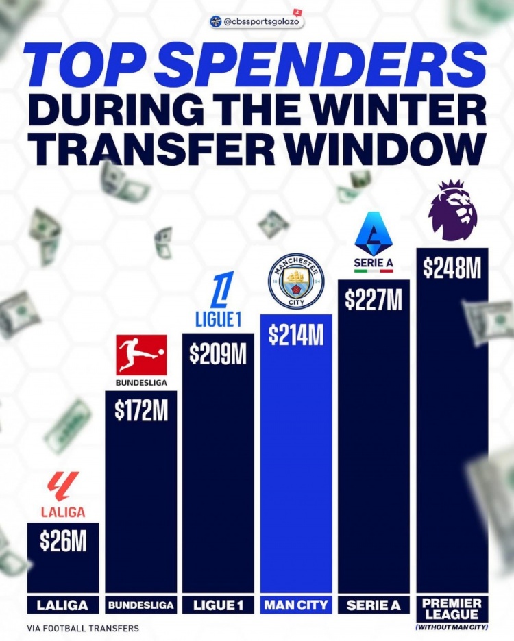 塞梅尼奥之后是格伊,曼城连续两年制霸冬窗。过去这12个月,曼城破费5.198亿欧元签入14名球员,仅支付的溢价便接近2亿欧元,成为同时期花钱最多的俱乐部。利物浦在2025夏窗曾制造出单个引援窗口的引援纪录,但论持续投入的力度和全面重建的决心,瓜迪奥拉的球队才是首屈一指的。