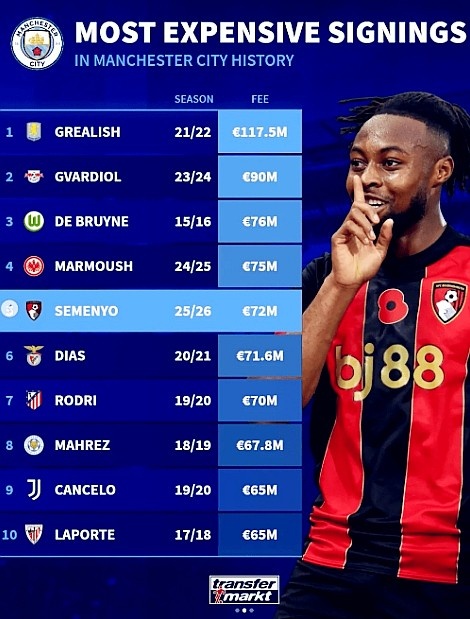 的球员也只有5人(格瓦迪奥尔、德布劳内、鲁本-迪亚斯、罗德里和塞梅尼奥),其他球员的身价基本都在2000万欧元到6000万欧元的区间内。