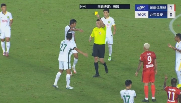比赛第77分钟,王刚无球状态下击打卡多索面部,主裁判看过VAR后对其处以黄牌警告。